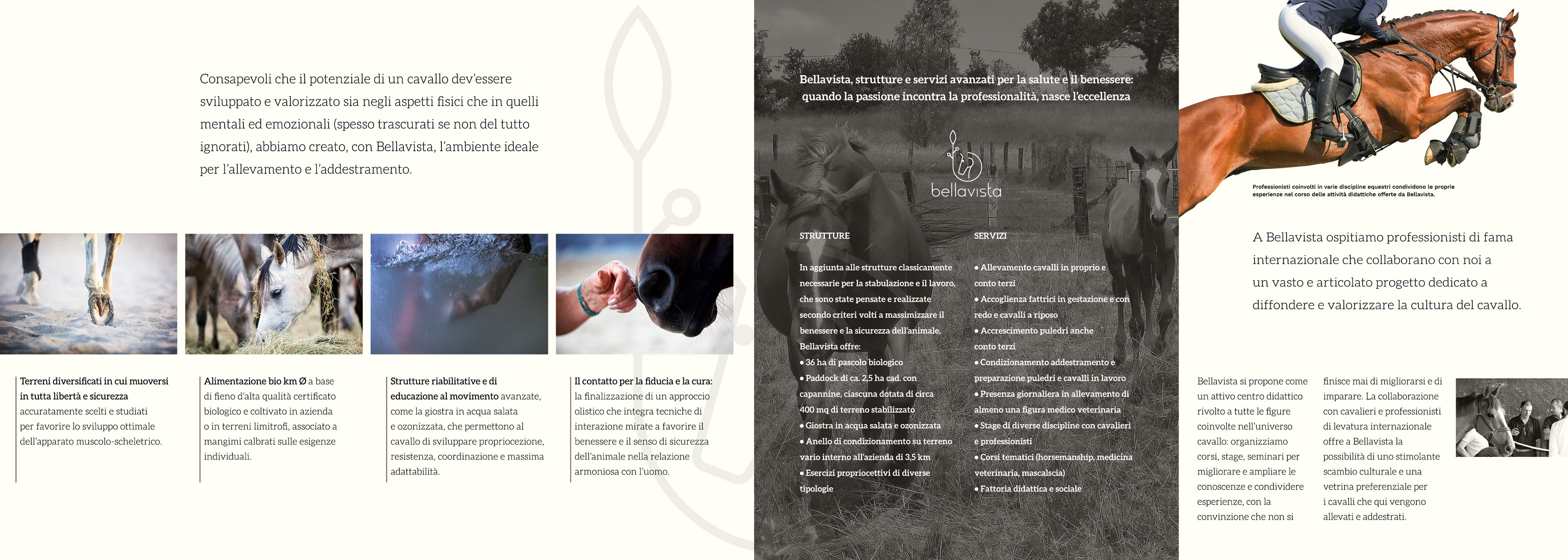 “Bellavista, nel cuore verde del Friuli, è l’ambiente ideale per lo sviluppo fisico, mentale ed emozionale dei cavalli giovani e adulti: qui sono accolti, curati, seguiti con attenzione amorevole; qui possono usufruire di strutture all'avanguardia nel loro genere, dedicate all'allevamento e alla riabilitazione, e di ben 36 ettari collinari di sano pascolo biologico.”